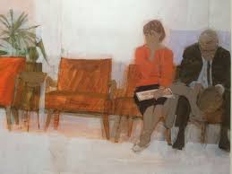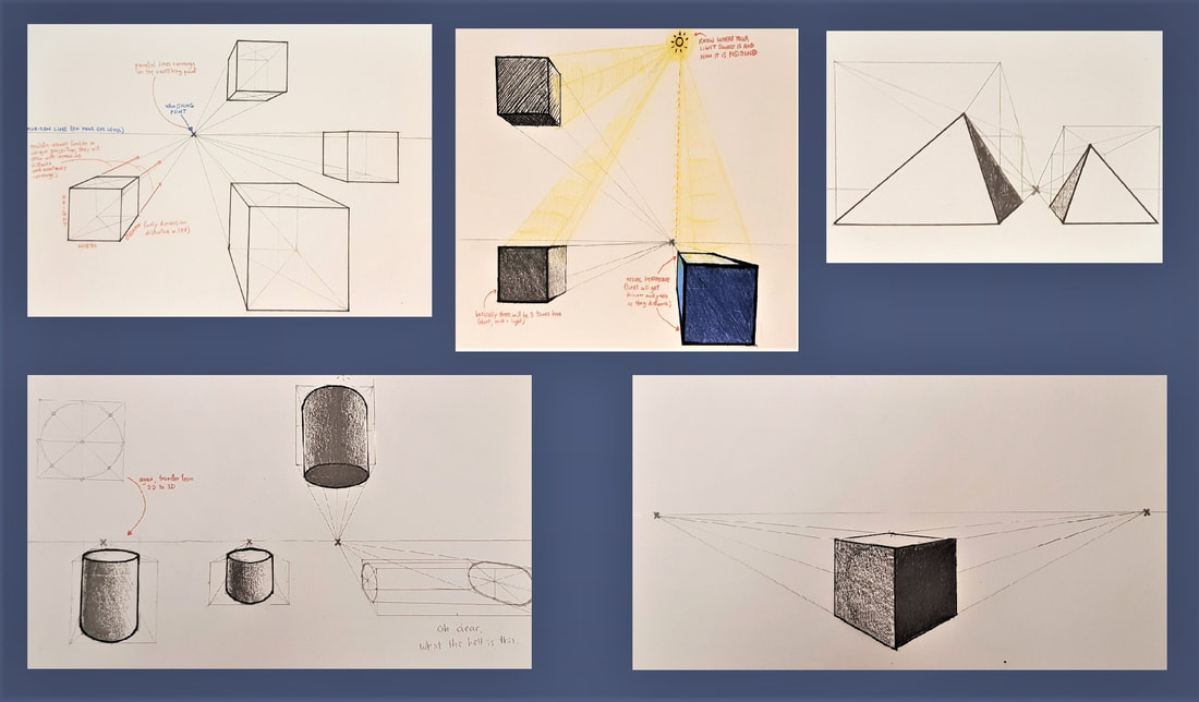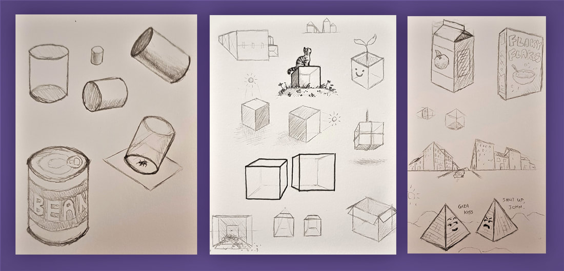 The three ideas I chose to finalise experimented with differing perspectives and interpretations. For example, I explored the use of the worm's view in one; placing Todd behind his unknowing victim to create dramatic effect, and convey a predatory sense of power. For the others, I chose to portray Todd himself as the victim. He states in the play that his former self is "dead" - this made me visualise his tragic past as a fatal wound, slowly bleeding out as he tortures himself with his pursuit of revenge. It seemed effective to make this fatal wound the same one he inflicts on his victims. Bob Peakillustrations by Bob Peak An American commercial illustrator, Bob Peak eventually came to be known as 'the father of the modern movie poster'. He earned this title through his famous poster work in the mid 90s - gaining a reputation after being hired to illustrate a poster for 'West Side Story', he went on to be hired as the illustrator for many other famous posters. He also illustrated for advertisements, alongside producing his own original illustrations. Though some of his illustrations lapse into more cartoon-like territory, Peak's work is mainly defined by a realistic style featuring unnaturally bright, often neon colours. Take his poster for the film 'My Lady Fair' - the entire background is a very "out there" shade of hot pink. Such an unmissable colour would catch the viewer's eye even from a distance. In contrast, the central illustration is done mostly in stark blacks and whites; only the figures of the main characters are lined and shaded boldly, highlighting their importance as protagonists. The eye then moves progressively to smaller detailed scenes around the focal point; these are coloured in an orange so similar to the pink that they appear undefined from afar. This is a clever trick to draw the viewer closer, making them pay more attention to the poster to quench their curiosity. Overall, the eye-catching combination of bright colours and stark contrasts is extremely effective for advertisement - whether it be a new clothing range or an upcoming film, his work was sure to draw the attention of the public to the product at hand. This ultimately lead to his famed reputation and his rise to success in commercial illustration. Bernie Fuchsillustrations by Bernie Fuchs Another notable mid-90s American illustrator was Bernie Fuchs. As a trumpet player, Fuchs' initial ambition was to be a musician. However, after losing three fingers in an industrial accident, he turned his attention to art despite having no experience. After graduating from university, he began his career illustrating car advertisements - word of his talent spread fast and soon he was a much sought-after illustrator, going on to work in magazines and portraiture. Fuchs had somewhat of a fascination with mundane scenes - the everyday man and his everyday activities. In theory, these should be boring concepts for an illustration. But Fuchs had a gift for making the mundane extraordinarily eye-catching. His paintings lacked bold lining, instead using stark colour contrasts to define people and objects. He had a tendency to use warm tones, but would tailor his colour schemes to the subject of the painting (note the pale clinical colours of the hospital illustration against the warmth of the café scene). However, the defining quality of Fuchs' style is the bizarre angles he chooses to illustrate from. His odd use of perspective hints at abstraction. By showing everyday life from rarely-used angles, he creates art from the ordinary - turning familiar scenes into new ones, if you will. This draws the viewer's attention despite the lack of action in his scenes. Practical TaskPerspective has always been something I have struggled with in my artwork; technical measures and spatial positioning have always confused me. I was apprehensive to have a go at these activities, but on the other hand I was eager to learn how perspective really works in order to better my work. Even learning the basic concepts (eg. oblique projection vs. realistic convergence) and getting to grips with the three dimensions was a useful starting point. We started off with 1 point perspective, which only distorts depth by using one vanishing point. We had a go at drawing some cubes, cylinders and pyramids using this technique. Out of these, I found the cylinders and ellipses the most challenging. After many failed attempts, I eventually felt a little more comfortable constructing a cylinder by using what I like to refer to as "the phantom box". 2 point perspective was relatively straightforward - using two vanishing points to construct shapes angled towards the viewer, distorting depth and width this time. You can see some of my notes and attempts above and below. In another 1PP exercise, we constructed "railroads" and "chessboards". I found this extremely useful when drawing an object that extends into the distance - the "zigzag" technique, points of distance, and the use of aerial perspective really helped me develop my proportional accuracy. You can see some of my attempts below. Something I was very keen to learn was how to better the anatomy of my sketches using perspective. Again, proportion is something I struggle with - especially when it comes to facial structure, limb length, placement of a figure on the page, and so on. I found the techniques we learned in these activities very useful, and have since noticed a visible improvement in my figure sketching.