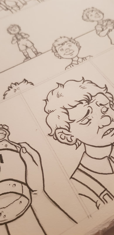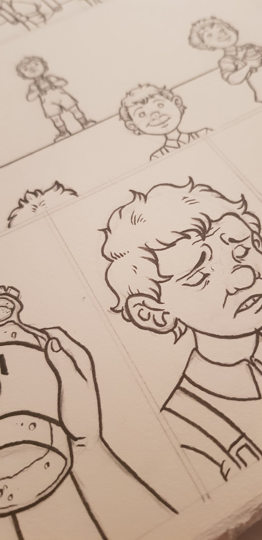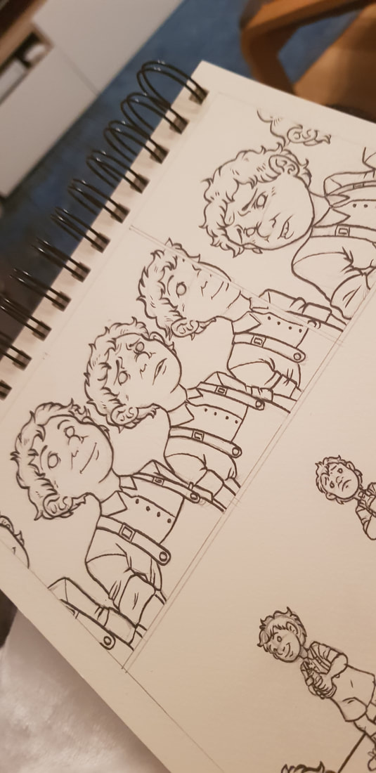 We decided the best way to split our workload between the three of us was to have one doing the linework, one on colouring and background/fine detail, and one pulling everything together with digital editing and layout. I was responsible for the linework; below you can see some pencil sketches plus the penned finals.