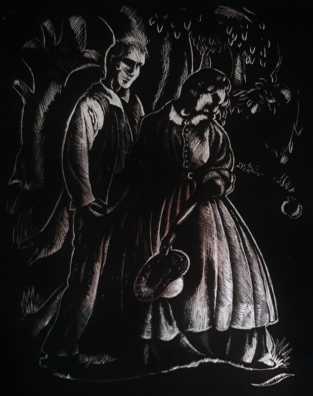 Instead of wood engraving, the project required us to recreate this on scraperboard. Unfortunately, I couldn't acquire proper scraperboard and had to use those metallic-backed ones you buy in the kid's arts and crafts section - that was my first mistake. I then could not figure out how to trace onto scraperboard, and had to freehand my attempt. The metallic backboard was so scratchy and uneven that I decided it was better to leave the background black instead of having it a messy, scratched silver. I found it really difficult to control how much weight I was putting on the scraper tool, and thus a lot of my lines are thick where they should be very fine.