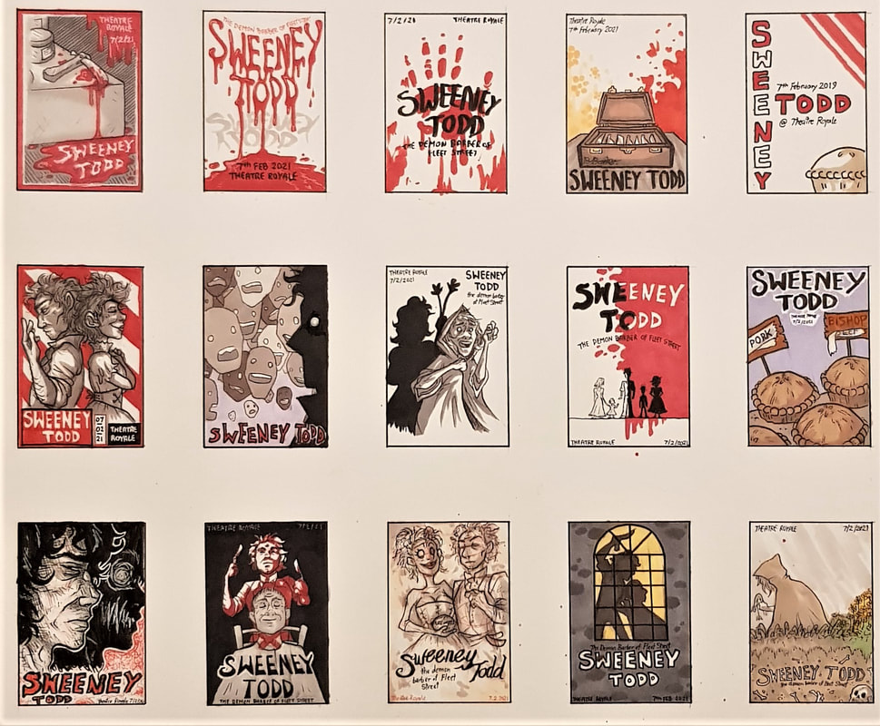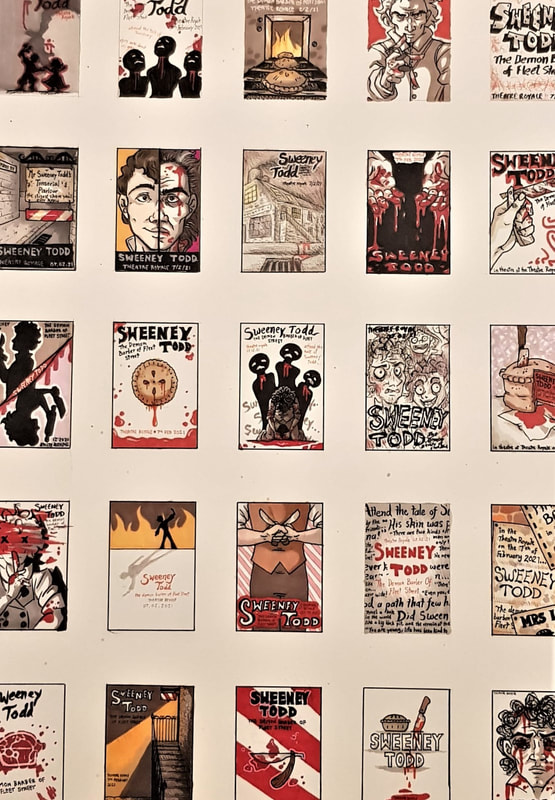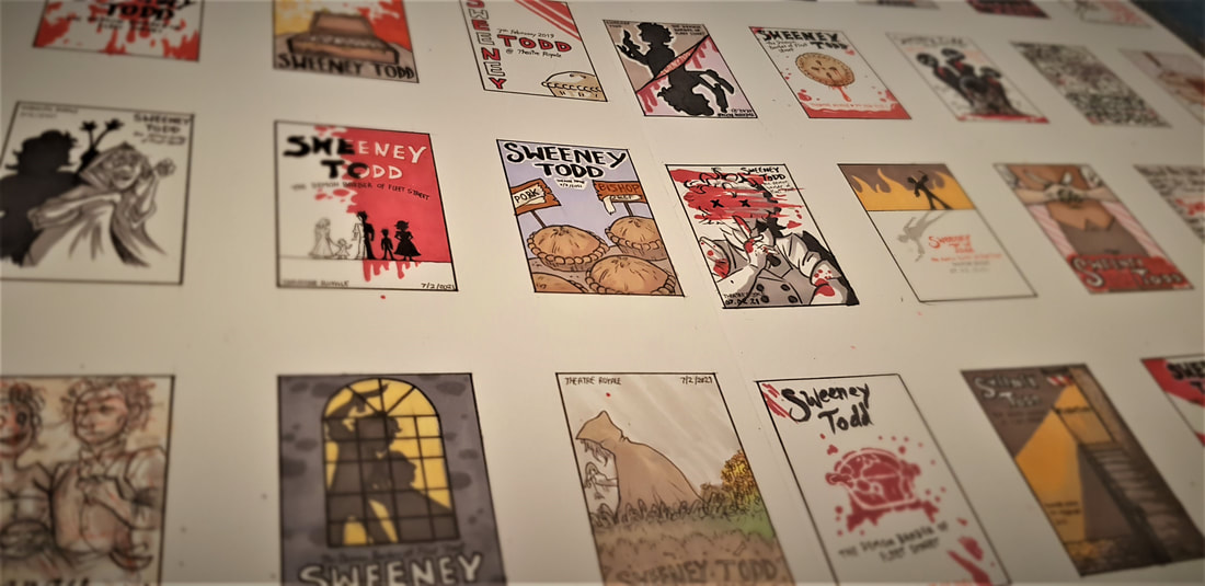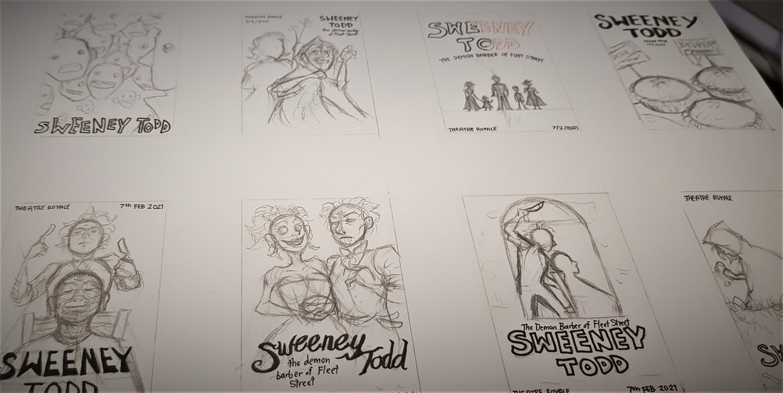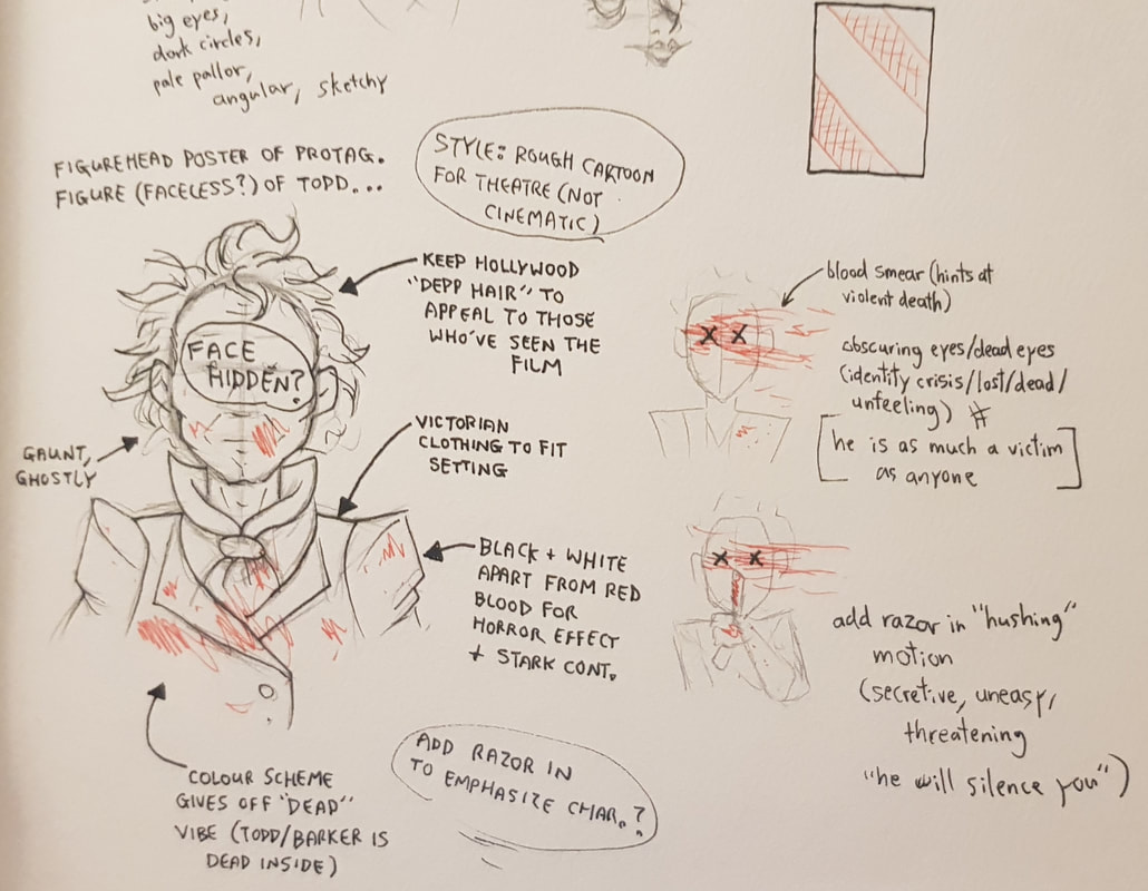 perspective from multiple angles. I am glad I chose to do this, since coming up with 40 different ideas for thumbnails proved to be quite difficult. Having knowledge of the play, its script, its music and the film adaptation definitely helped with generating ideas. Some of the thumbnails use symbolism and subtle details from the script, whilst others are much more literal - either way, I tried to create images that didn't give too much of the plot away, 40 thumbnail visuals I also made sure to keep in mind that our task was to produce a theatre poster, not a film poster. I find the two often differ greatly; film posters tend to be more cinematic, utilising modern photography and digital effects. Theatre was around long before we had these tools at our disposal - traditionally, other than word of mouth, the only real way to advertise an upcoming play was via illustration. Many modern theatre posters still champion this method, favouring illustration and graphic design over photography and often appearing more stylised than realistic. The aim of any advertisement poster is to draw the viewer's attention to the product. Ideally, it should visually pique their interest, encouraging them to consider said product. To do this, an effective combination of colour, composition and subject must be used. Right away, with Sweeney Todd as my "product", I knew I would be making good use of a bleak and minimalistic colour scheme. 3 final client visuals I chose to use only red, black and white in my finals. Red and white are of course the trademark colours of a barber - historically, this was to symbolise their practice of bloodletting, and the white bandages used to stem the bleeding. This (rather beautifully) correlates directly to the plot of Sweeney Todd. Adding black provided depth and contrast, resulting in stark images that both draw the eye and convey the morbid themes of the play.