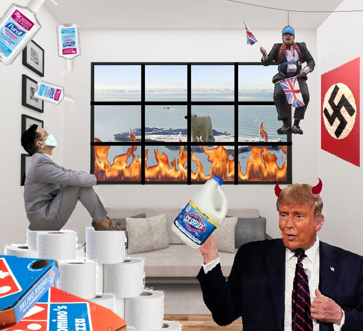 To the right, I focused more on the political highlights of the year. I had to include Boris at the top, hanging from his zipwire in probably the single most infamous picture of him in existence. The image itself automatically gives off a sense of absurdity and incompetence, in turn referencing nationwide doubt of Johnson's abilities to lead, especially in crisis. Below Johnson, I have included Donald Trump below the Nazi swastika, since his deplorable actions during his presidential term have led many to compare him to the dictator Adolf Hitler. I added devil horns to highlight the worldwide threat this man poses - the danger of his choices and actions exceeds the borders of his own country, impacting the entire globe. The bleach was added just as a reminder of the stunningly bad ideas of our so-called world leaders - reading deeper into this, one could question the very direction humanity is heading in if we are willingly electing people like this to lead us into the future.