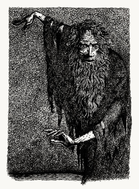 I had used ink before in calligraphy, but I had never drawn with it; the closest experience I had was with brush pens, which I use quite often in my own art. In all honesty, I didn't do much practice before attempting a firm copy - I inked a few lines, working out how to change the thickness by angling the nib, and I covered small areas in scribbles and strokes in an attempt to mimic Peake's techniques. I then traced the basic outline and began to ink the final. You can see some progress photos below: