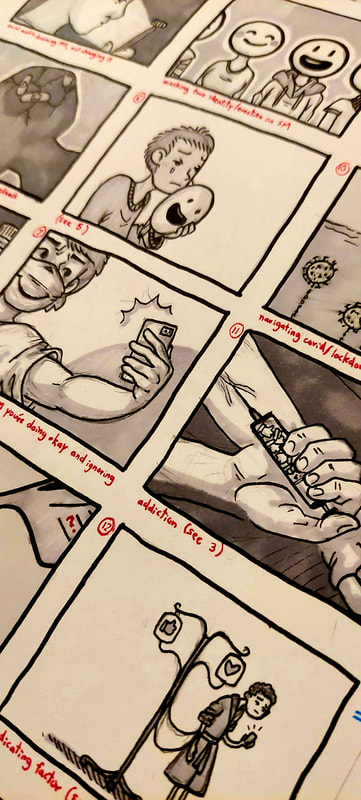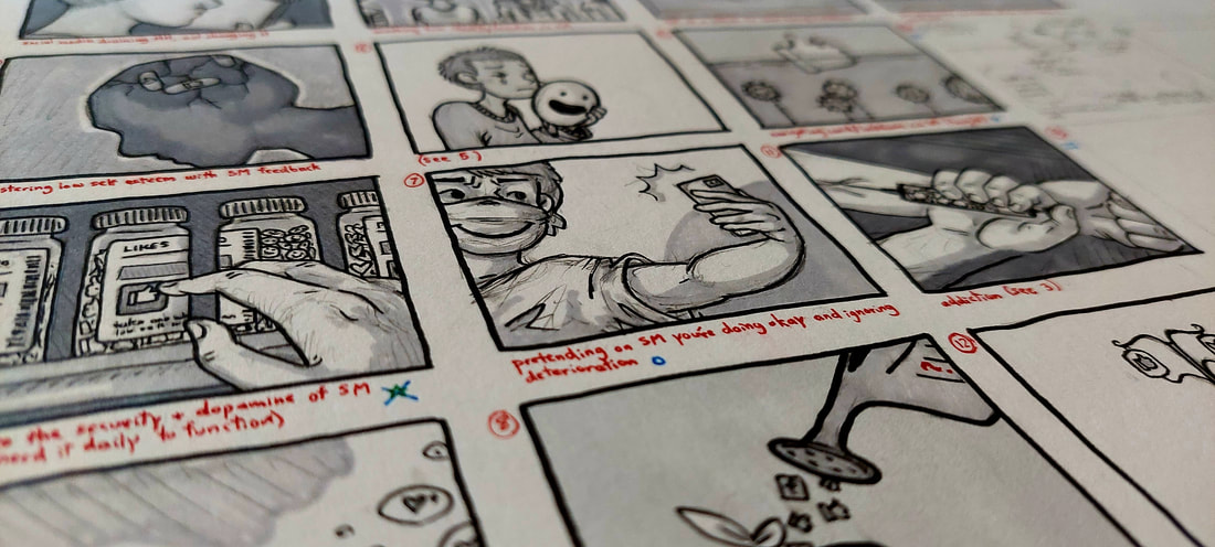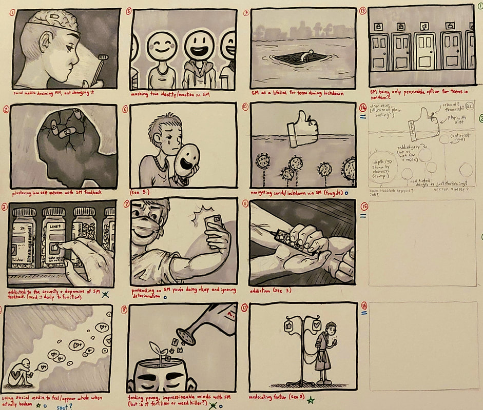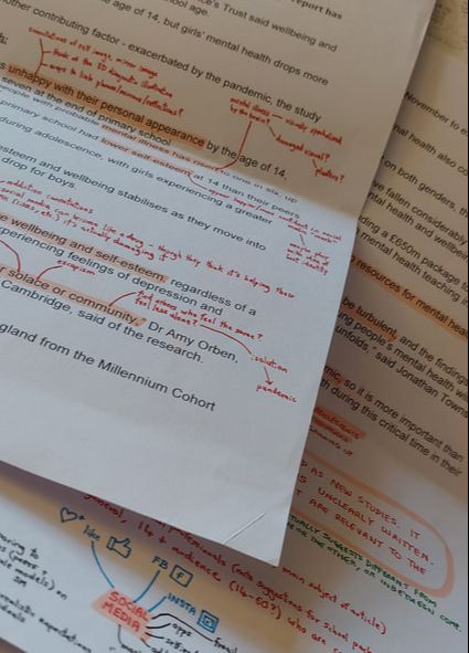 Looking at my individual brief, I read the article I had been assigned. It is titled 'social media damages teenagers' mental health, study says' (read it here). Bit close to the bone, but alright. I actually found the article quite irritating. In my opinion, it's poorly written, doesn't tackle the titular issue, constantly goes on irrelevant tangents... but I suppose that's a challenge illustrators have to face. Some projects you work on aren't going to be ones you like or are particularly eager to do. So if anything, I guess it was practise for those circumstances! I couldn't contain my passive aggression in my initial annotations, though. |