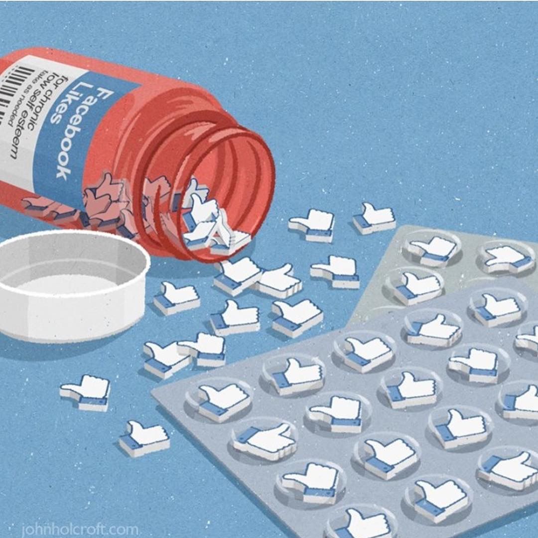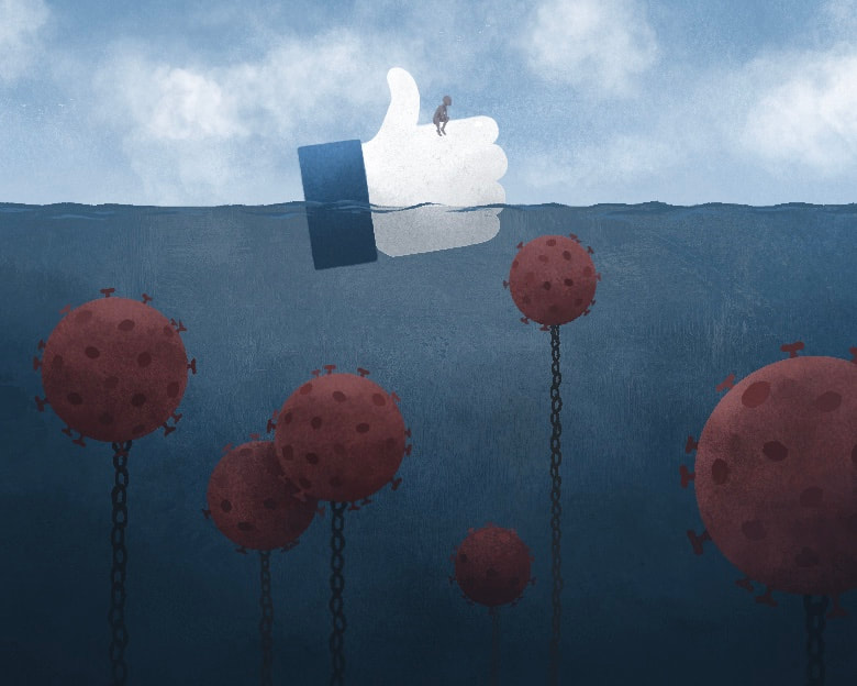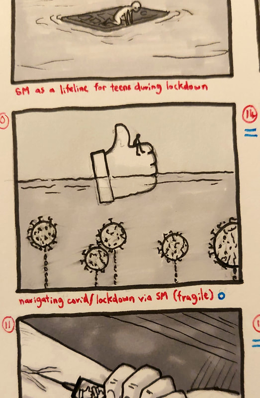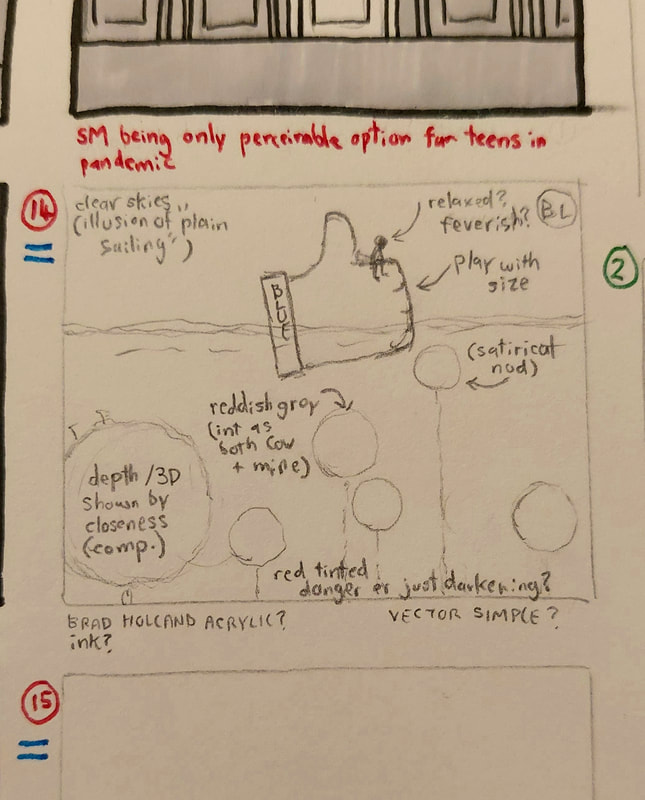 After redoing my narrowed-down choices in more detail, I ended up going with the 'floating thumb'; a figure atop the iconic Facebook emoji (the famous 'like'), navigating an ocean of sea mines. The idea was to use the thumb as a symbolic 'lifeboat', and the sea mines (bearing close resemblance to Covid-19 molecules) as both a symbol of instability and the pandemic. Social media has been a lifeline for many young people throughout the pandemic; a means of negating the isolating effect of lockdown. This is shown by the |