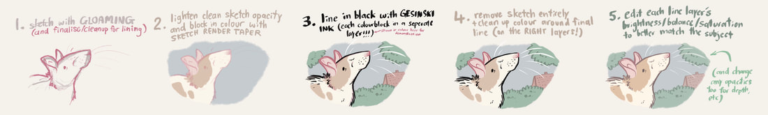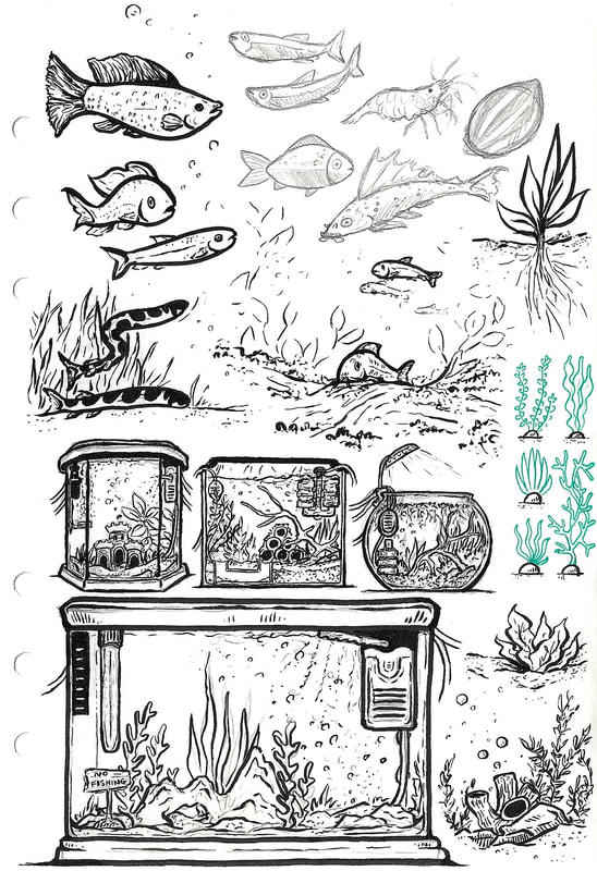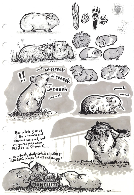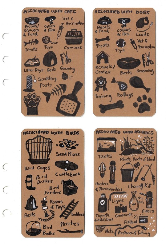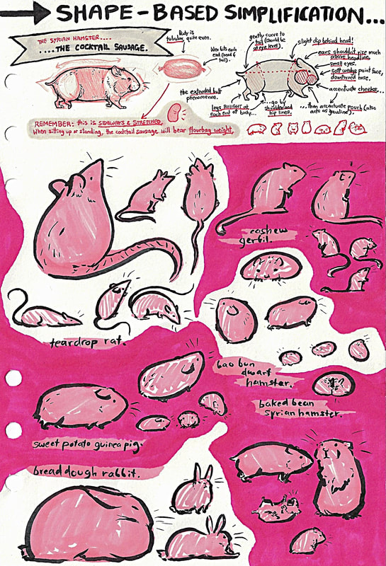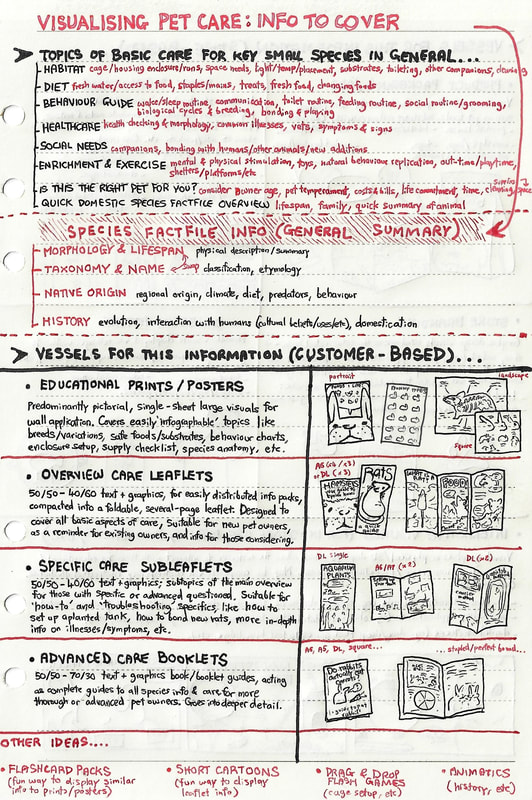 Inspired by the effectiveness of infographic guides, I wanted to explore and utilise a simplistic style for these visuals. However, I wanted to add elements of expression, humour and fluidity to veer slightly from the rather clinical, stiff style of some of my influences. Below are some of my initial analogue sketches testing out style using shape, expression, linework and colour/tone. I thought of "key" domestic species of exotic pet most commonly encountered in pet retail, and drew a page of sketches for each.