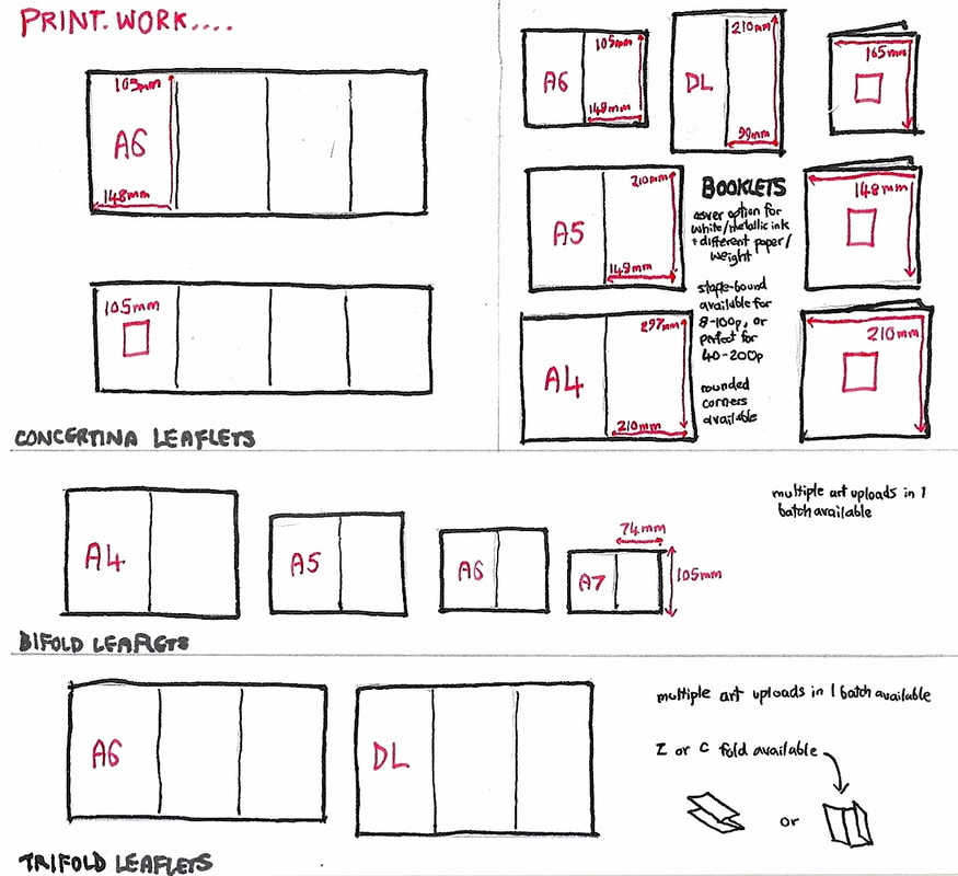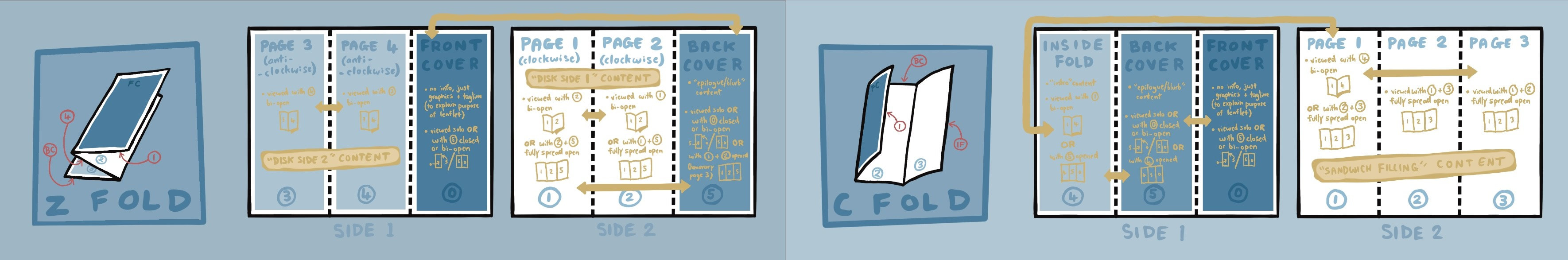 Inspired by the lackluster retail leaflets I mentioned earlier, I had a go first at designing more visually-engaging leaflet pages - pages in which the visuals enhanced the communication of information, as opposed to there being barely any amongst screeds of words. The diagram of Z-fold and C-folds was me trying to wrap my dyspraxia around leaflet layouts to ensure I got the right order of info across the pages.