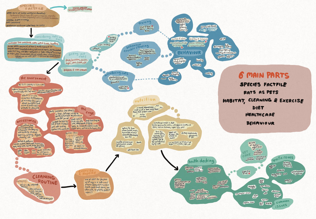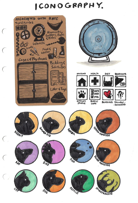 This project focuses on just that. The aim was to conceive hypothetical plans for a visual pet care range that would be both engaging and informative; an accessible educational tool for pet owners. I planned to create a sample from this range, illustrating information and care on key domestic species, to demonstrate how the use of effective visuals could improve on current available guidance.