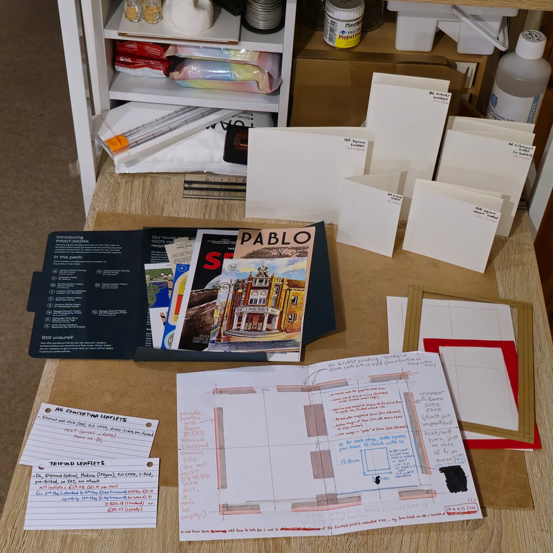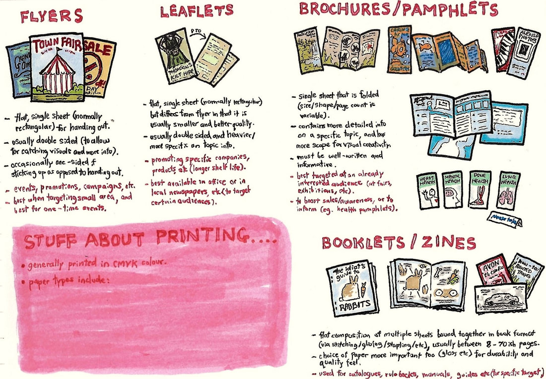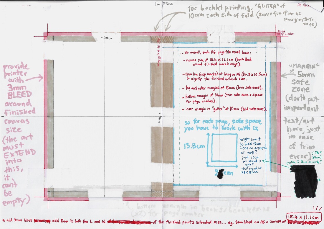 Above you can see my notes on printing. I had to learn a lot about printing requirements such as bleed and safe zones; I do not have a technical brain, so this was ridiculously difficult. I got there in the end in my own way.