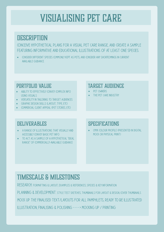 As well as reflecting personal passion, I felt this project had good potential for portfolio value. The brief challenges me to demonstrate ability in multiple areas such as visual communication, graphic design and versatility, and could also appeal to potential clients in the illustration and/or pet care industry.