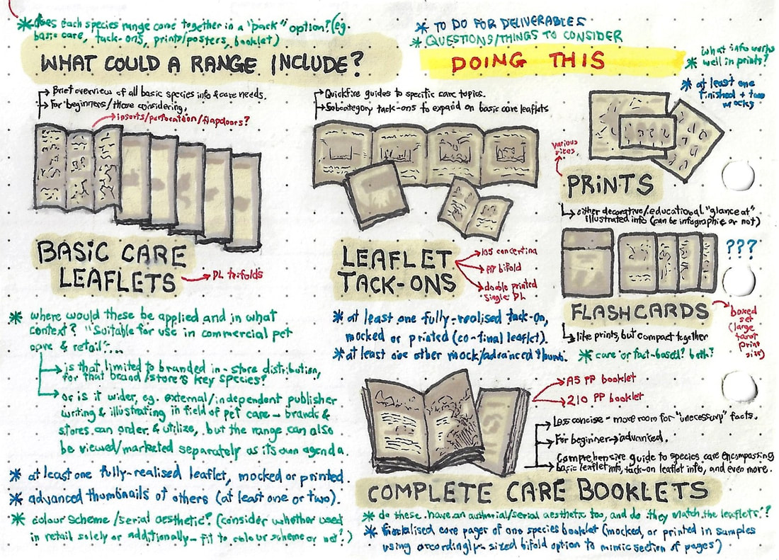 Having explored ideas, I decided the range sample I was going to create would include one of a hypothetical sub-range of complete care booklets tailored to each species. I wanted this to be an approachable, visually engaging and enjoyable guide whilst still being able to convey comprehensive care advice and information.