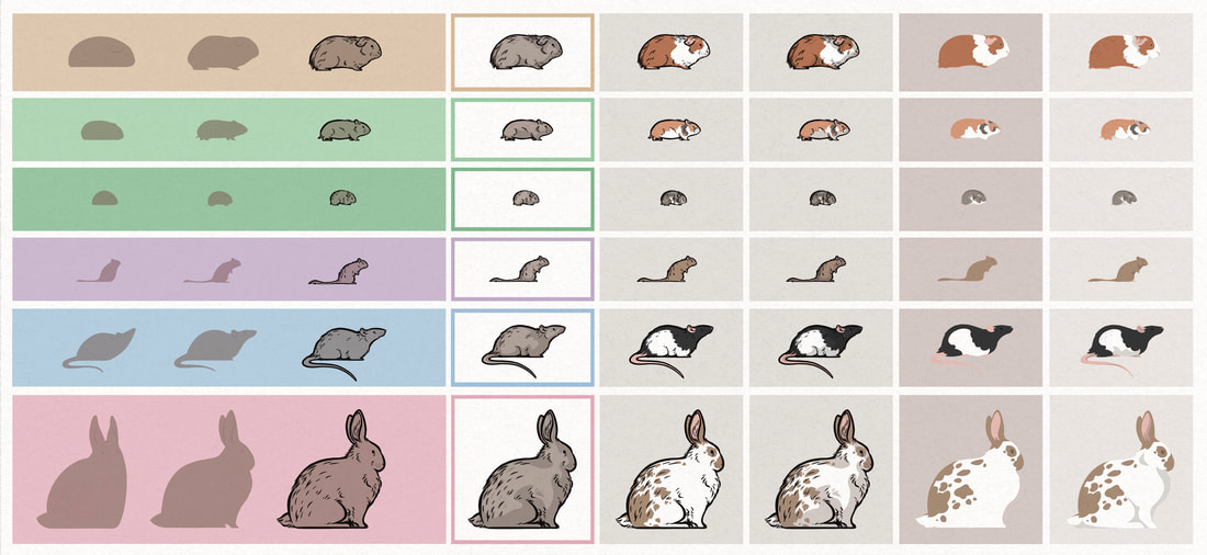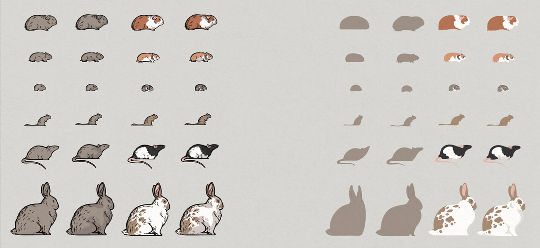 Above are the finalised variations of digital icons for rabbits, rats, gerbils, guinea pigs, Syrian hamsters and Russian dwarf hamsters.