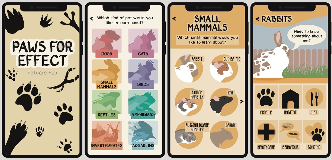 Below are the finalised designs visualised for use in the conceptual app, 'Paws For Effect'. Below that is a sample of screen mocks imagining the app in use, featuring a start-up page, a main menu, a small mammals sub-menu, and a rabbit care homepage.