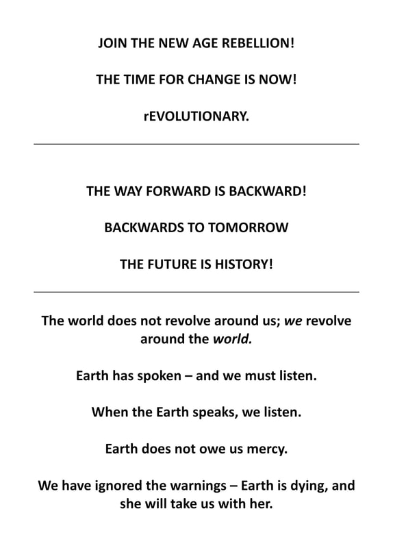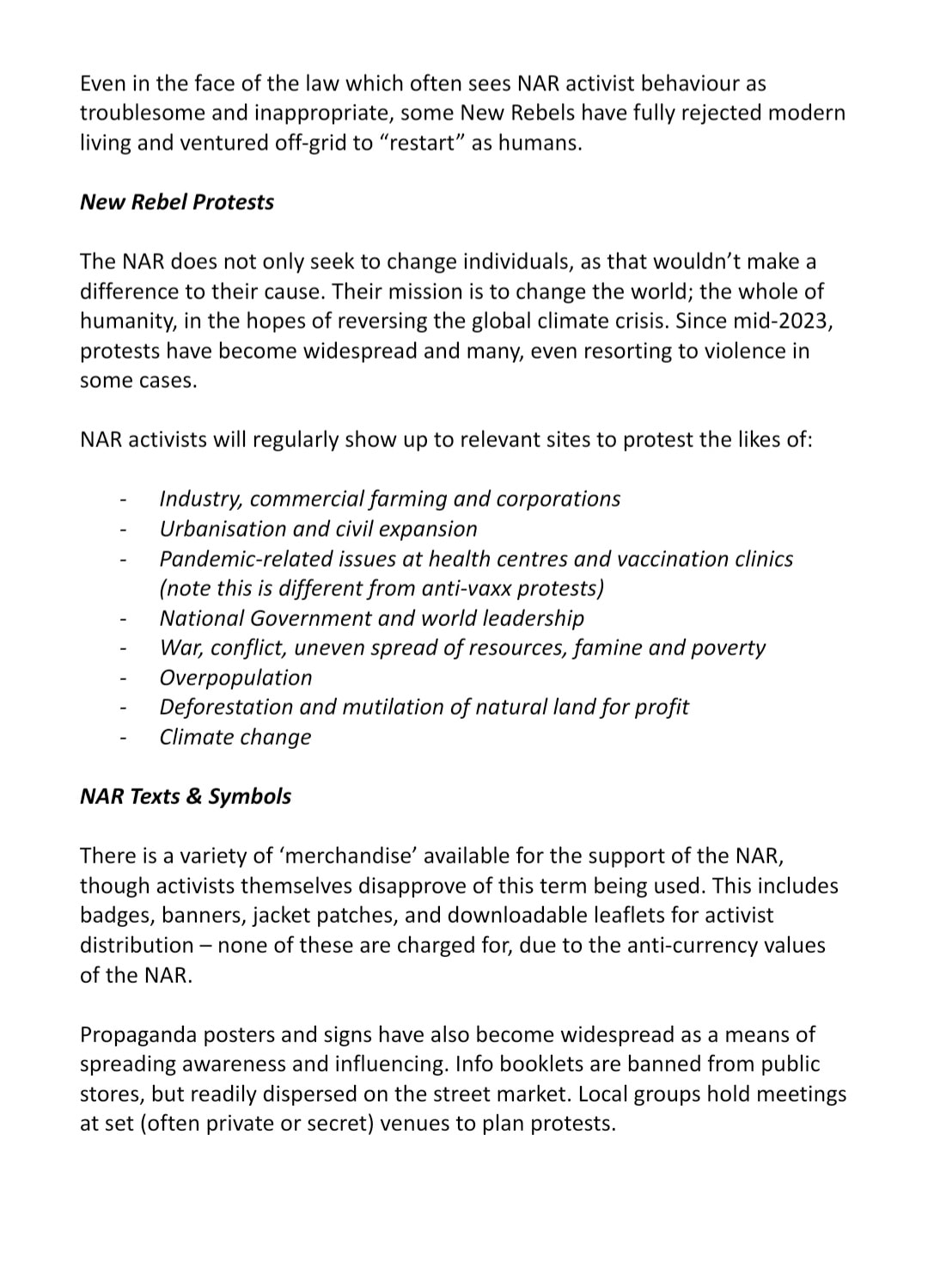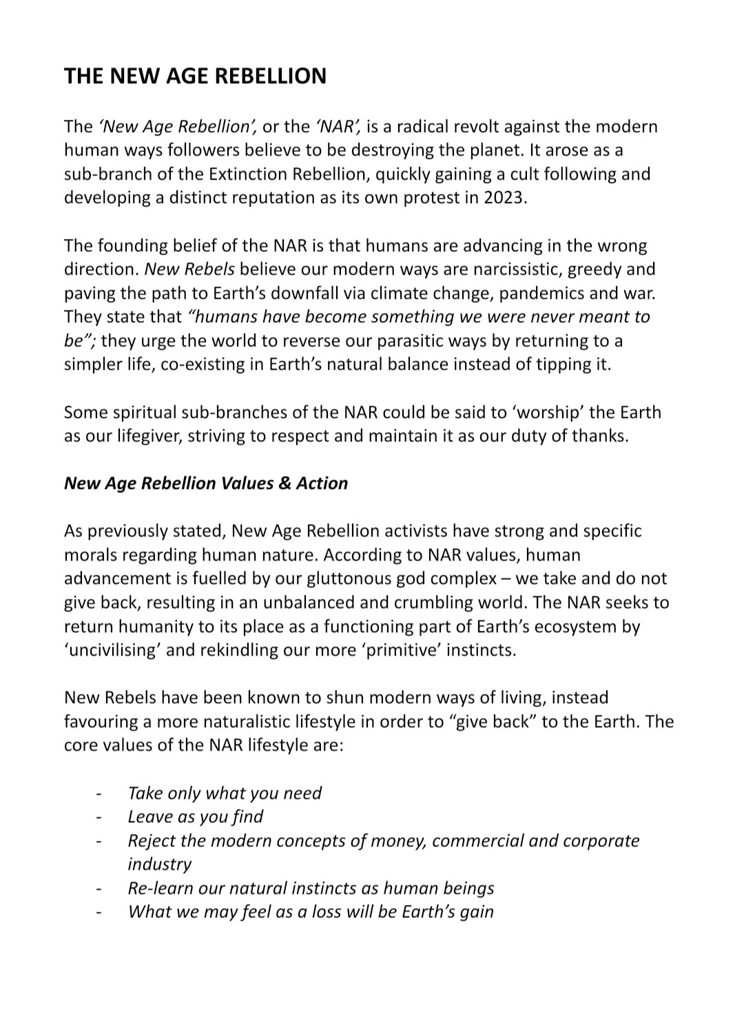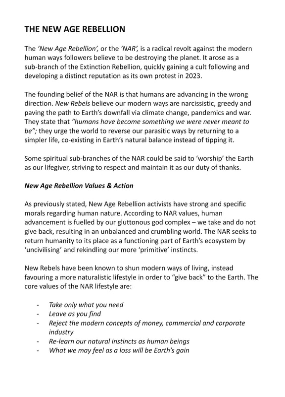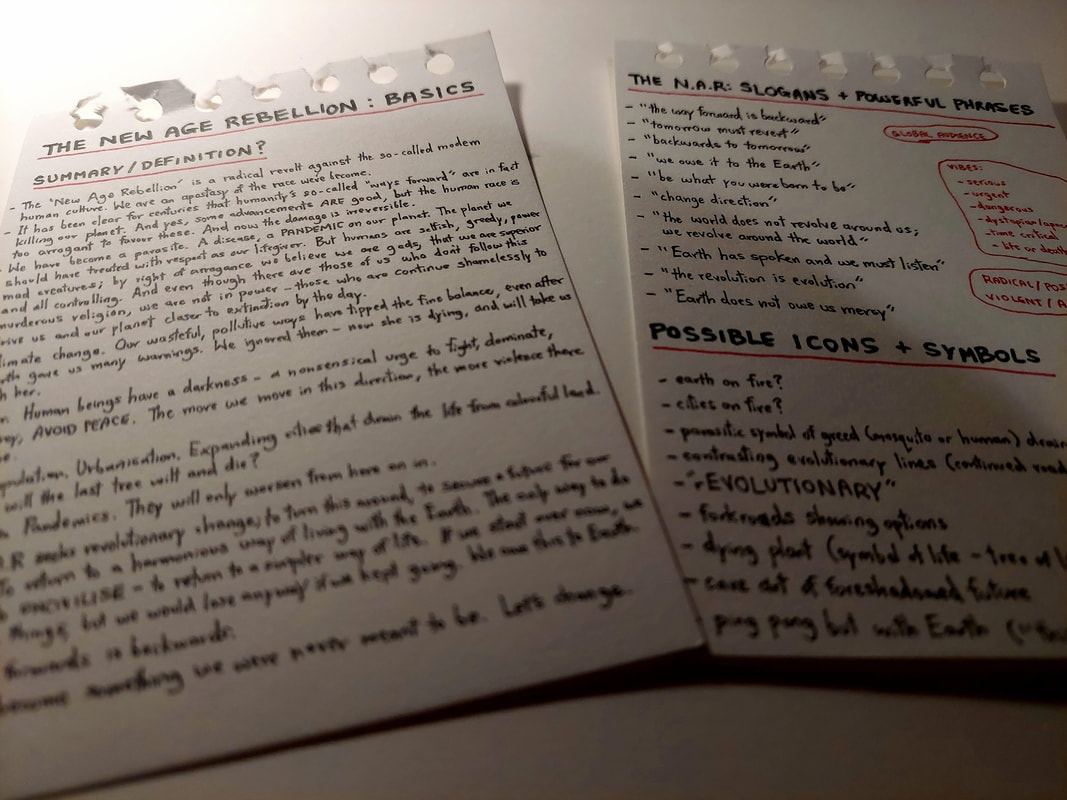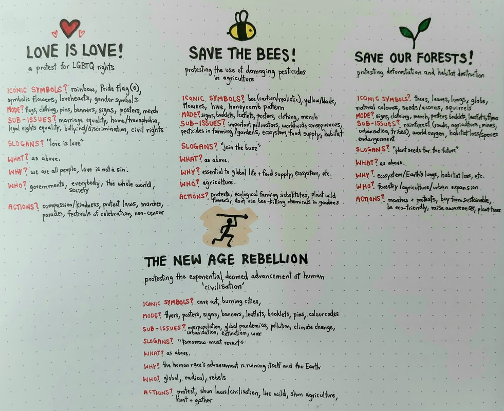 My concept was a bit odd in terms of the protest issue being a future one. The idea behind this was to imagine an issue that could potentially arise within a few years time, to give it a sort of urgent and dystopian feel. I tried to take the Extinction Rebellion and climate crisis protests and bend them into a concept I dubbed the New Age Rebellion - a future sub-group of the Extinction Rebellion with the belief that humans must "devolve" out of our modern ways if we are to survive. It's difficult to explain in few words, so I've added my conceptual notes below.